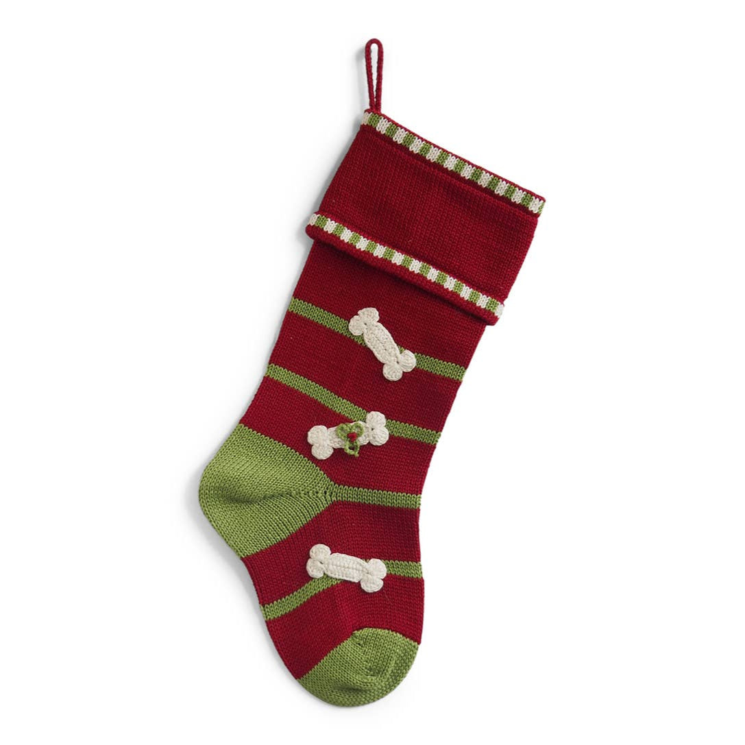 - Red stocking with hand-embroidered dog bones and thin green stripes.