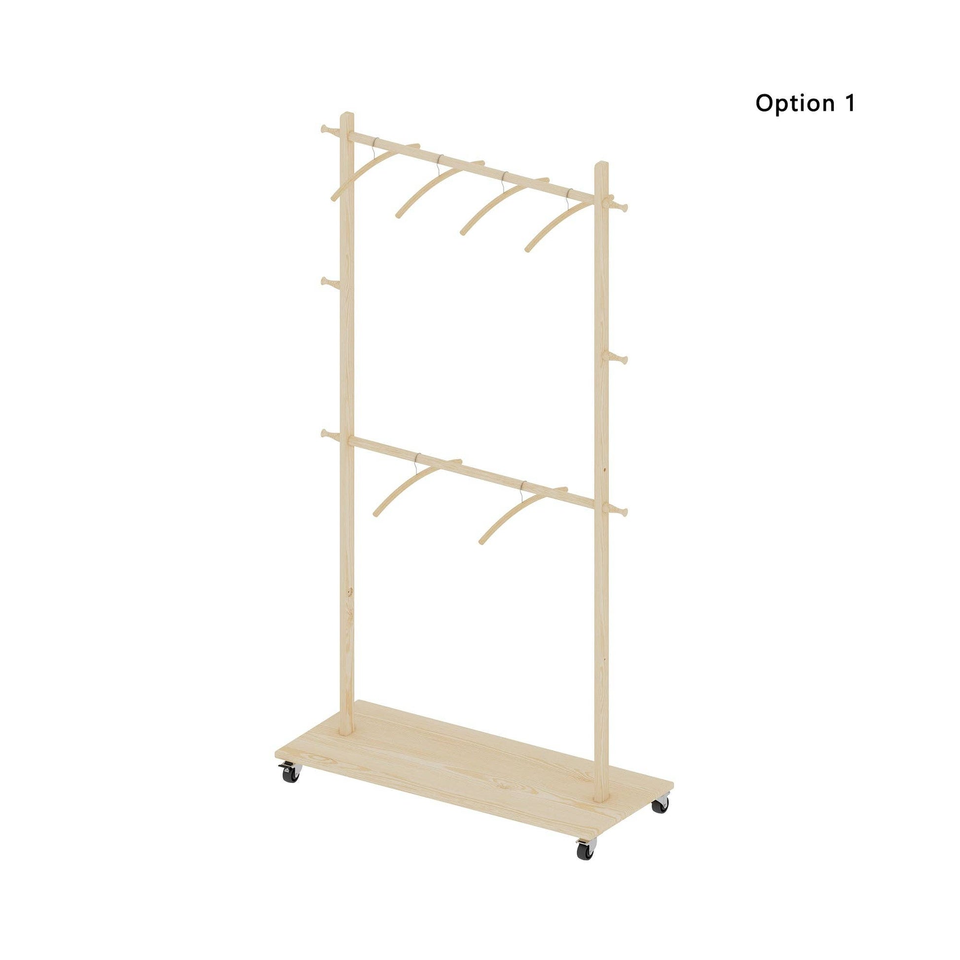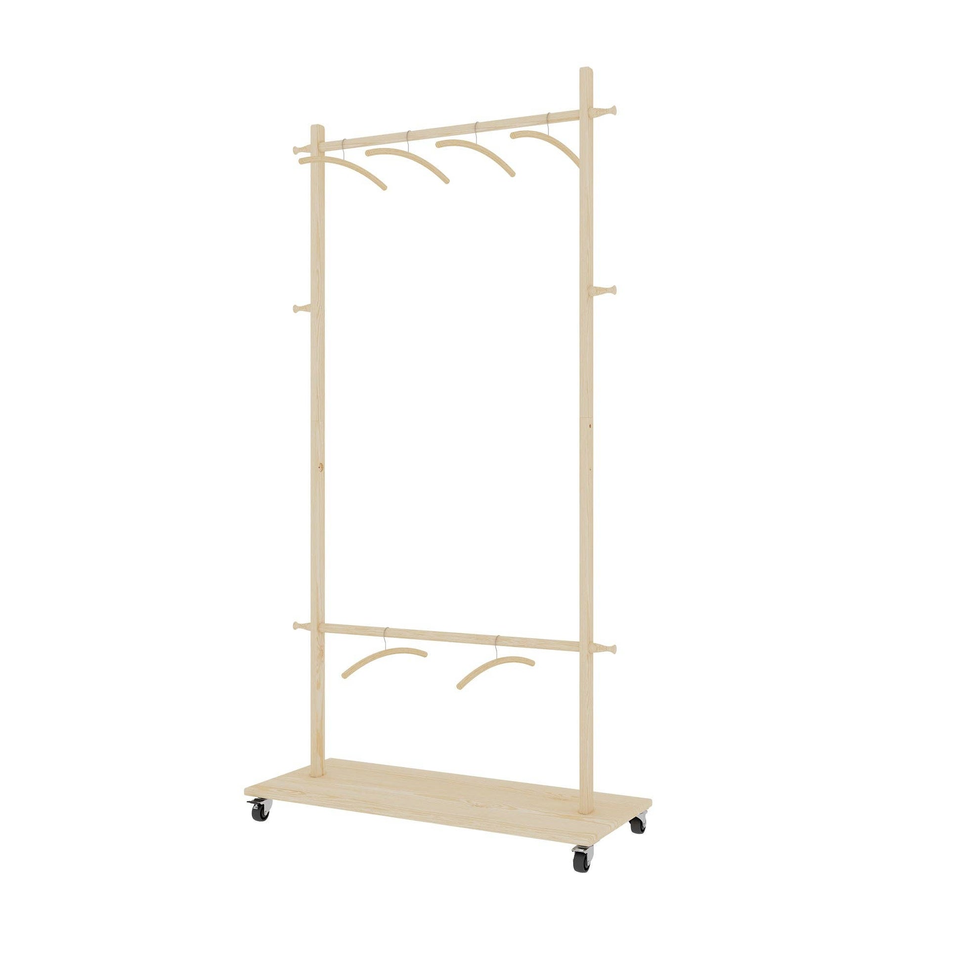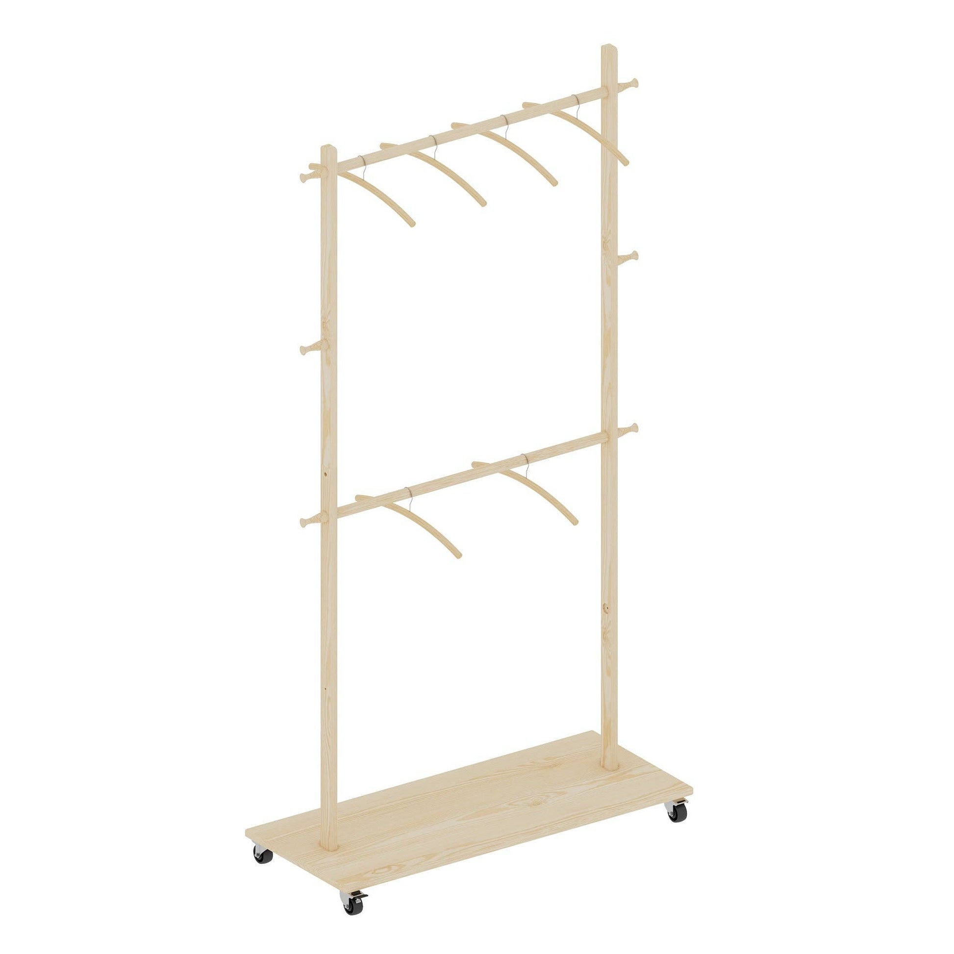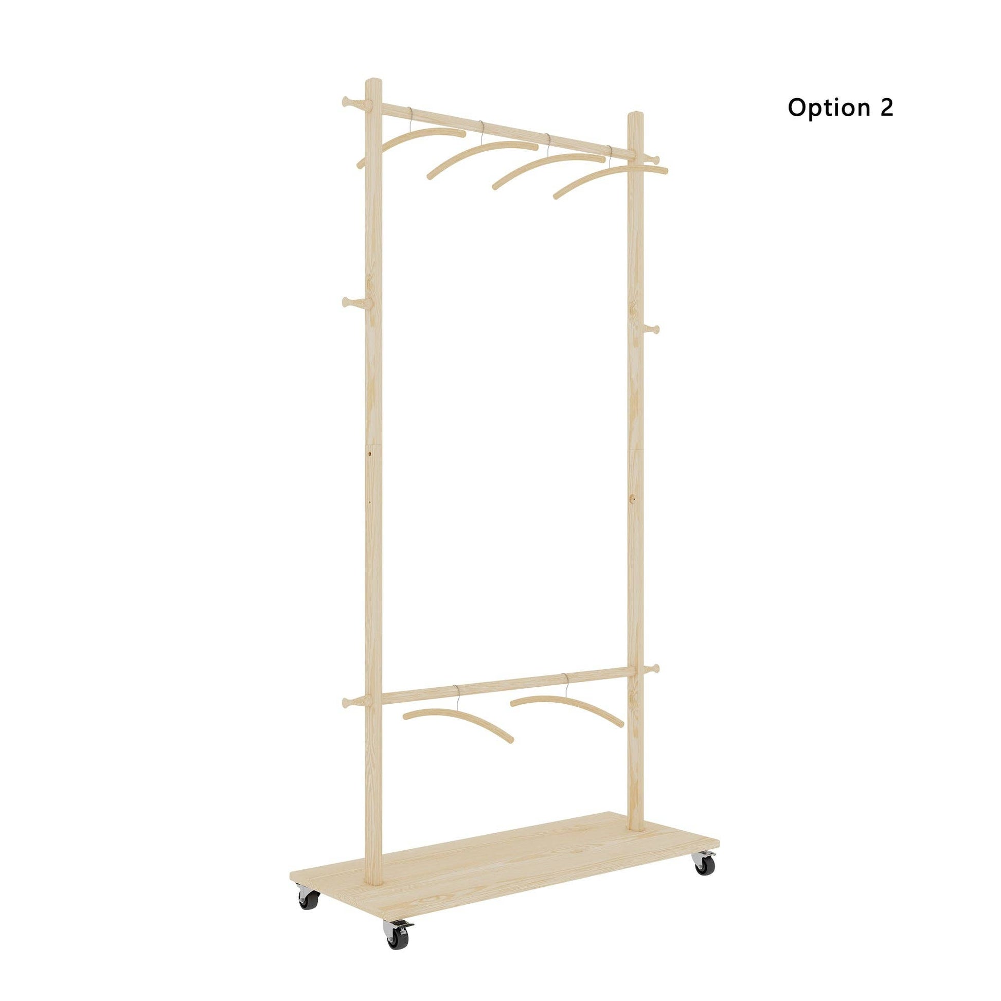 Organize your space in style with this solid wood garment drying rack, featuring a minimalist frame, six wooden hangers, and an adjustable shelf for added storage. Designed for versatility, it offers hanging space for clothes, scarves, and accessories, while four wheels ensure easy mobility between rooms. The natural pine finish adds warmth to bedrooms, entryways, living rooms, or boutique displays. Ideal for home use, fashion shops, or retail showrooms seeking functional elegance.
