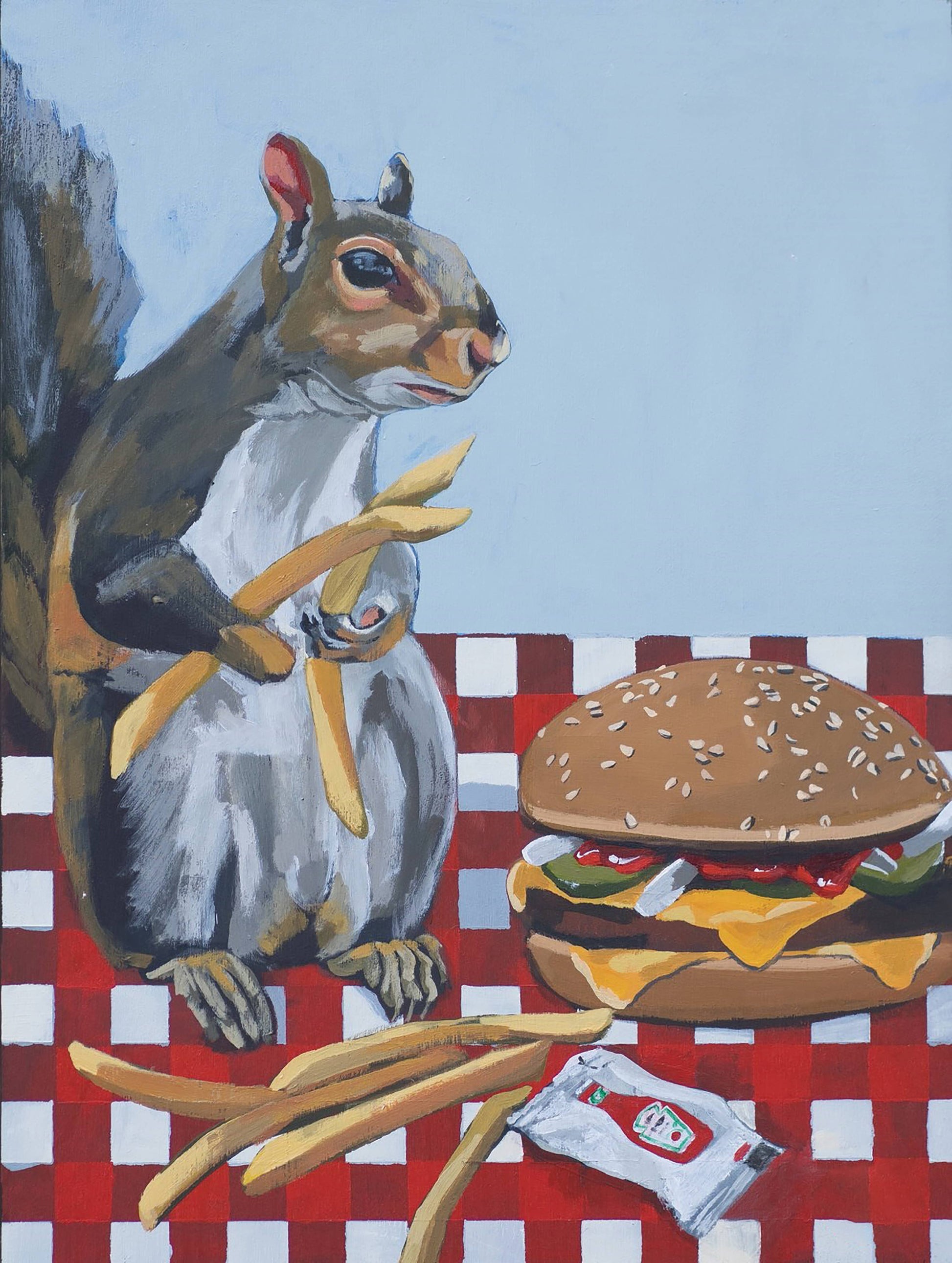The patch is made from Flyn Costello's original painting, "Squirrel Burger" for a series of work called Shared Environment which explores interactions between us and our animal neighbors.