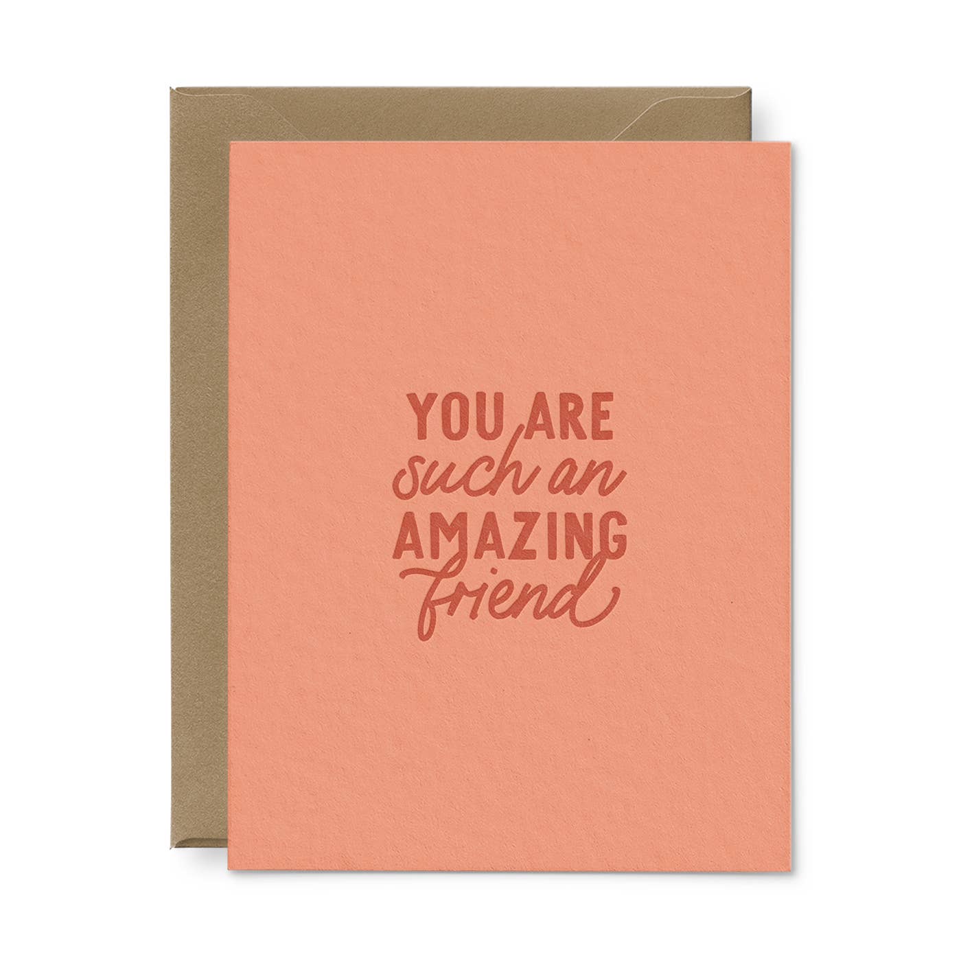A letterpress card to show your friend just how much they mean to you. This friendship card is blank inside for you to express your appreciation for a friend. This card is perfect for an everyday surprise, birthday, or thank you to a great friend.